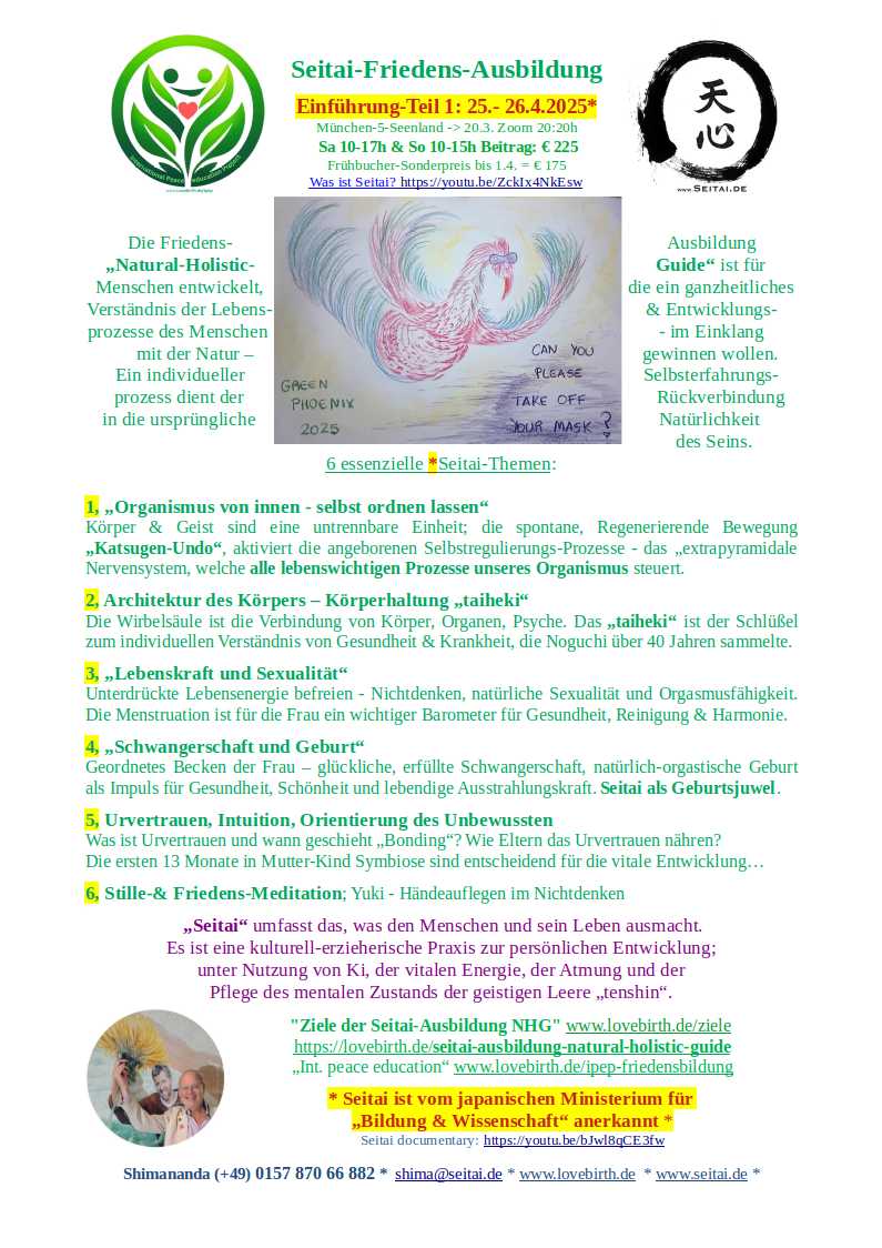 unsere Vision "Friedensbildung an den Wurzeln" – das Leben von der Empfängnis bis zur Entfaltung - zu unterstützen, damit eine starke, bewusste und natürlich gesunde neue Generation heranwachsen kann. Seitai-PEACE-essenz "Friedensbildung" NHG 25.-26.04.2026