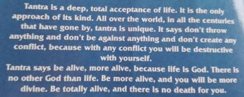 Tantra ist eine tiefe, vollständige Akzeptanz des Lebens. Es ist der einzige Ansatz dieser Art. Überall auf der Welt, in allen vergangenen Jahrhunderten ist Tantra einzigartig. Es sagt: Wirf nichts weg, sei gegen nichts und schaffe keine Konflikte, denn mit jedem Konflikt zerstörst du dich selbst. Tantra sagt: Sei lebendig, lebendiger, denn das Leben ist Gott. Es gibt keinen anderen Gott als das Leben. Sei lebendiger, und du wirst göttlicher sein. Sei vollkommen lebendig, und es gibt keinen Tod für dich. VBT-Osho